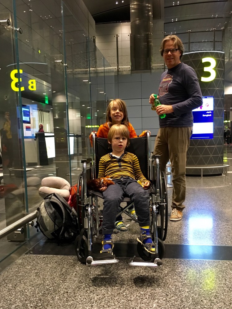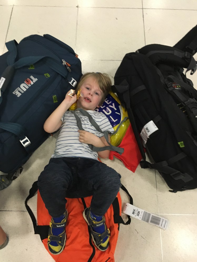 In Thailand krijgen mensen met kleine kindertjes altijd overal voorrang. Zouden ze in Nederland ook mogen invoeren. Nooit in de rij hoeven staan, altijd overal hulp en priority. Helaas voldoen onze kids daar vrees ik net niet meer aan gezien hun leeftijd… Toch hadden we geluk! Aangezien ik oververmoeide duuk heel tactisch droeg werden we uit de langste rij voor de immigratie ooit gehaald!! Halleluja. Dat is namelijk echt niet tof na zo’n reis. Of je nu kinderen bij je hebt of niet….