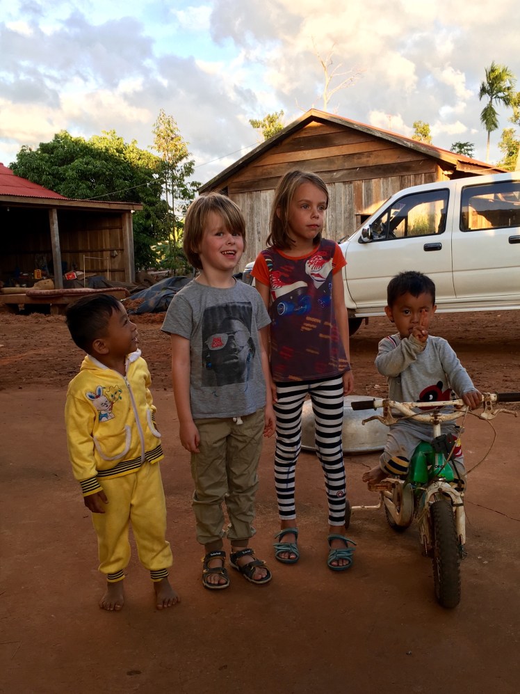 Zoals de titel al zegt. We zijn op een 2daagse tocht met een landcruiser troopie door het laatste onaangetaste regenwoud van Cambodja. Helaas was het al 6 uur rijden en het geduld van de kinderen op toen we de eerste boom tegenkwamen. Halverwege slapen we in een guesthouse waar ze weer dol zijn op duuk en zijn bleekscheten huidje. Iedereen knijpt hem in z’n wangen, slaat op z’n billen en wil met hem op de foto. Duuk ondergaat het gelaten.