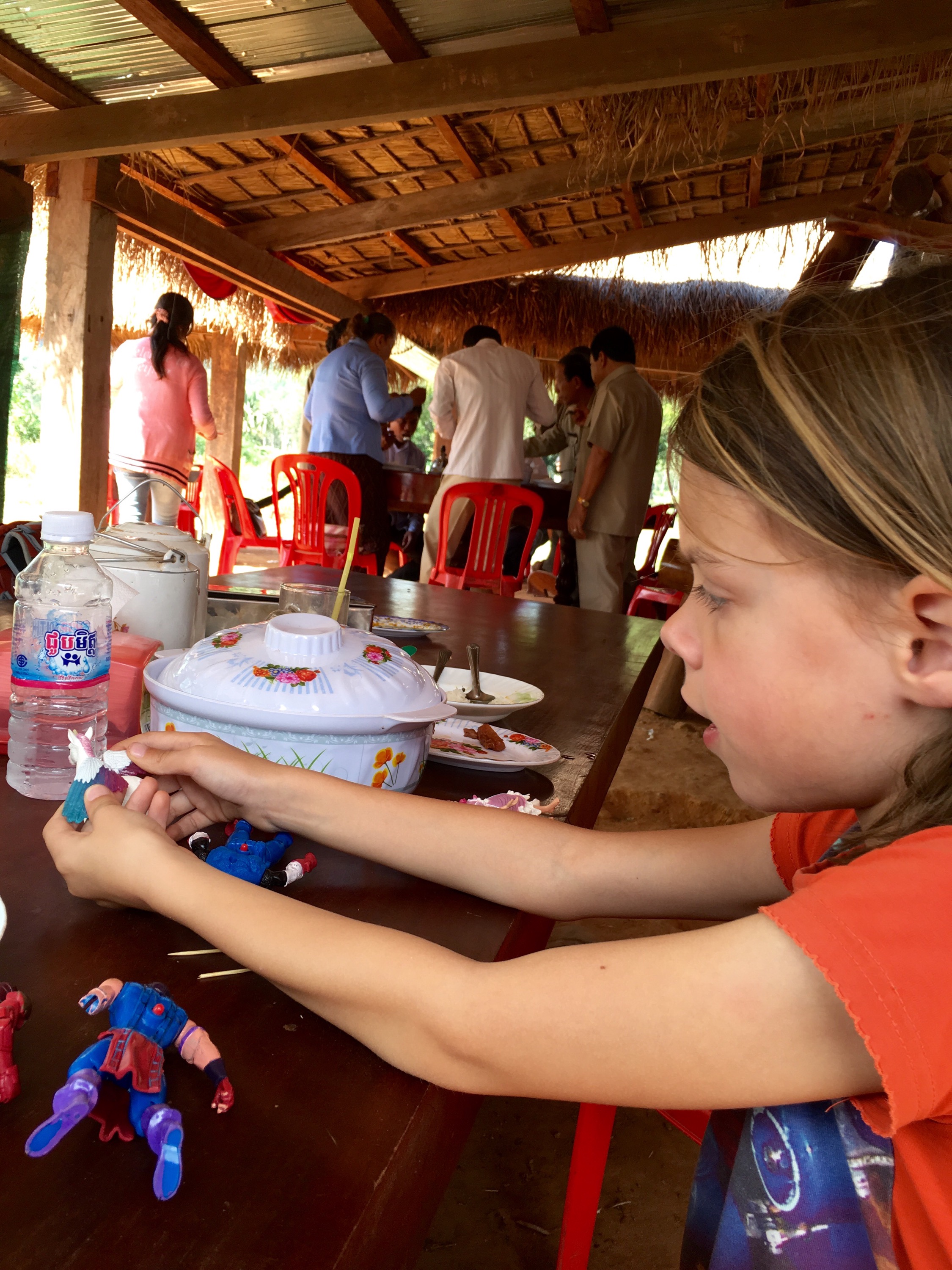 Zoals de titel al zegt. We zijn op een 2daagse tocht met een landcruiser troopie door het laatste onaangetaste regenwoud van Cambodja. Helaas was het al 6 uur rijden en het geduld van de kinderen op toen we de eerste boom tegenkwamen. Halverwege slapen we in een guesthouse waar ze weer dol zijn op duuk en zijn bleekscheten huidje. Iedereen knijpt hem in z’n wangen, slaat op z’n billen en wil met hem op de foto. Duuk ondergaat het gelaten.