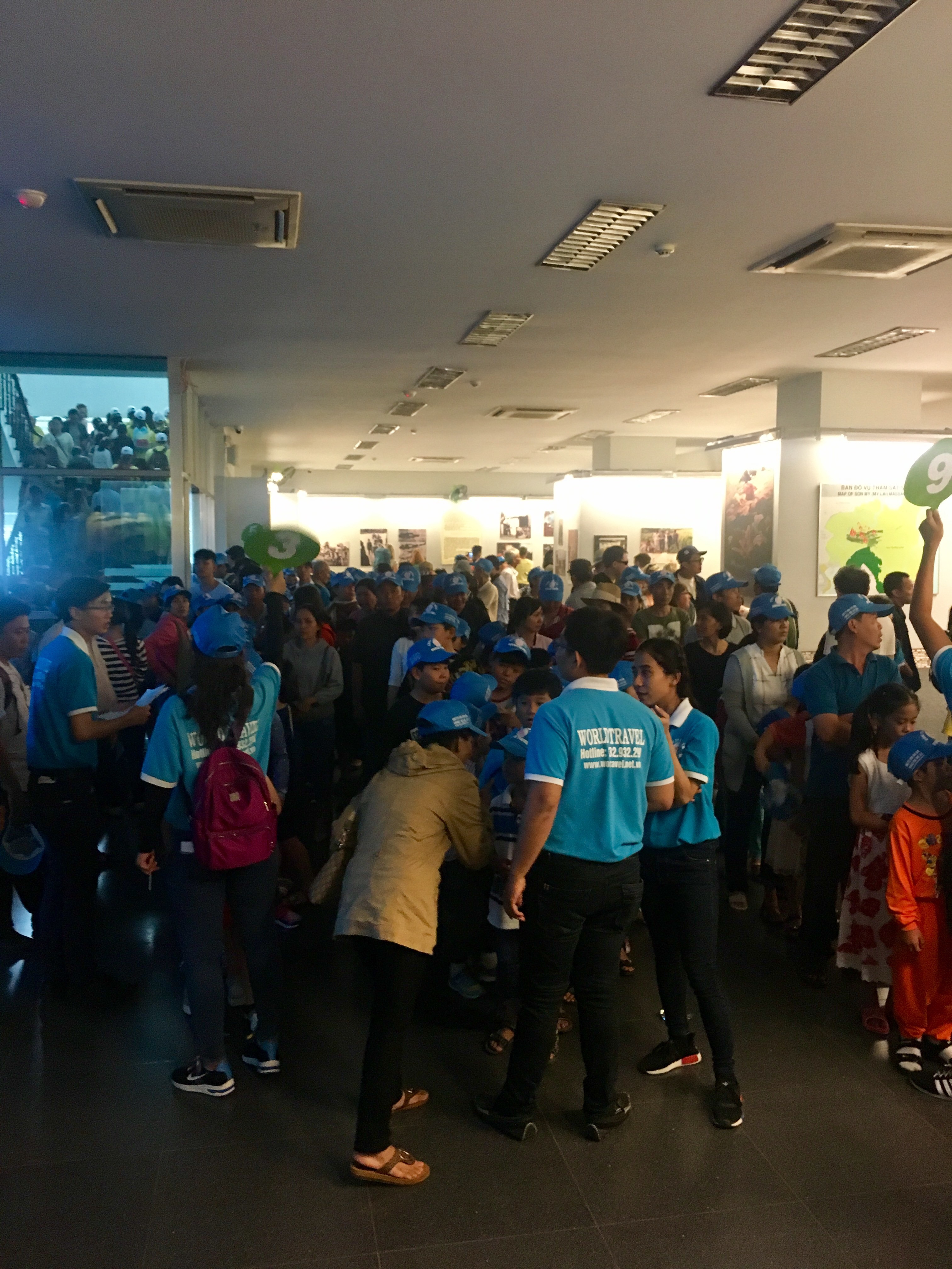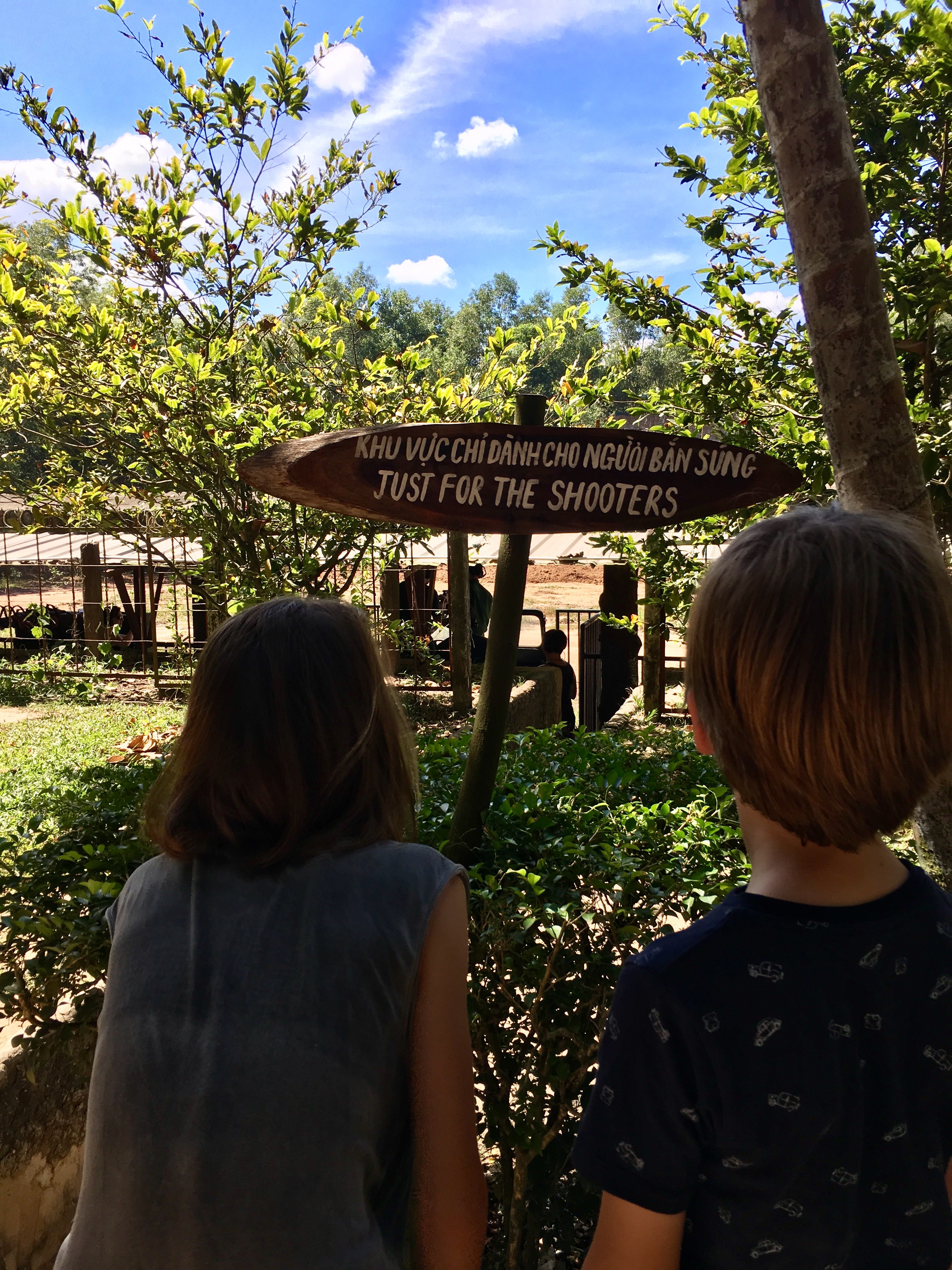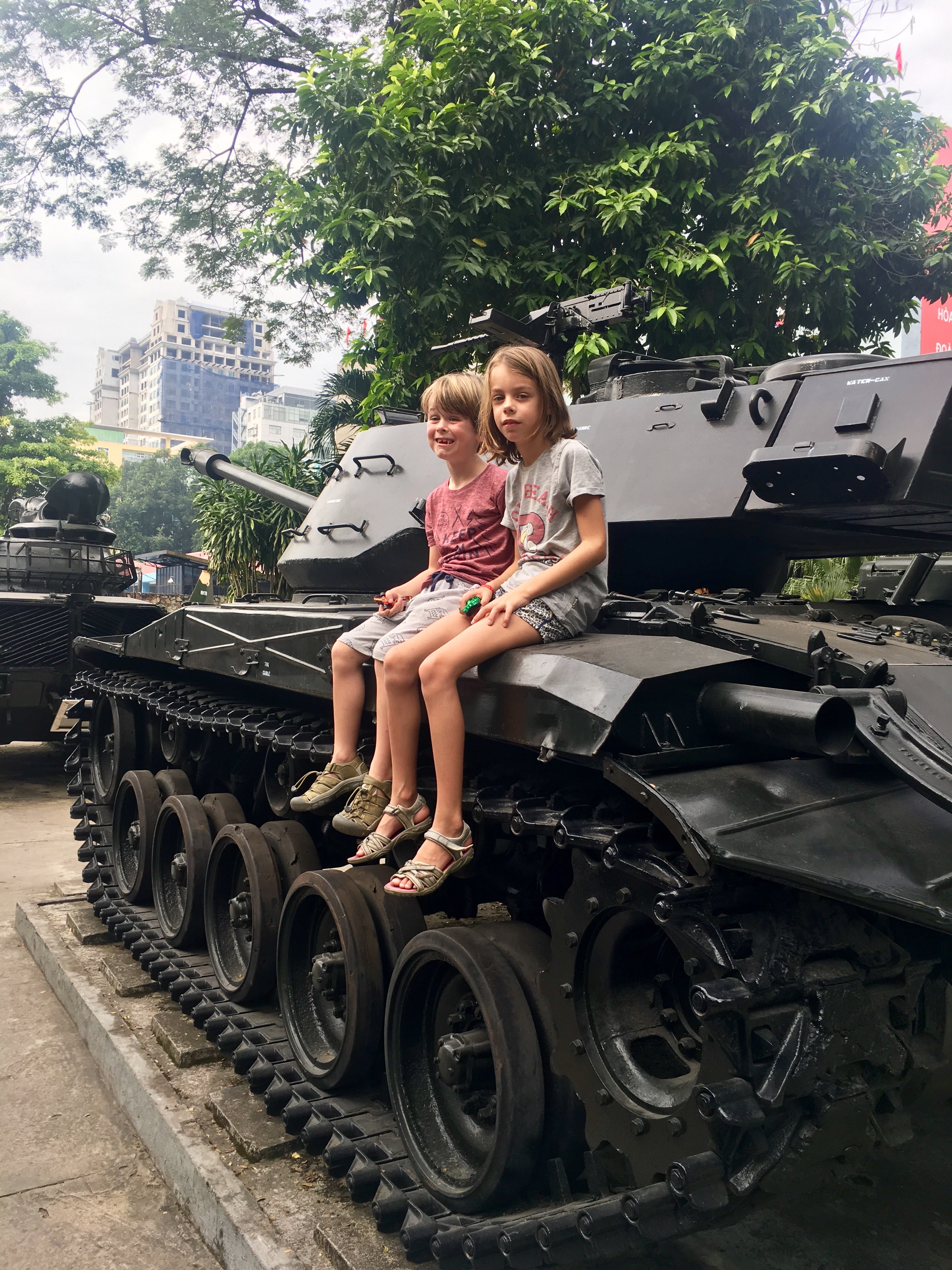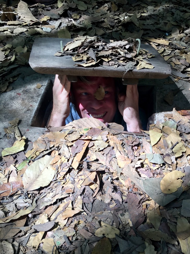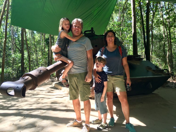 We hebben van alles en nog wat gedaan en werden daarbij achtervolgd door Vietnamese schoolklassen, zowel in het waterpark als het museum. Het museum bevatte allerlei gruwelijkheden over de Amerikaanse oorlog hier in vietnam. Verder nog naar een erg hoge toren geweest met supermooi uitzicht. Bij deze toren hebben we geposeerd voor de meest kitscherige foto ooit! Natuurlijk kon ook een bezoekje aan de tunnels van cu chi niet uitblijven. Weer allerlei nieuwe inspiratie opgedaan op het gebied van boobytraps (die Vietnamezen waren geniaal op een vrij gruwelijke manier…). Ook een bezoekje aan de water puppet show mocht niet ontbreken.