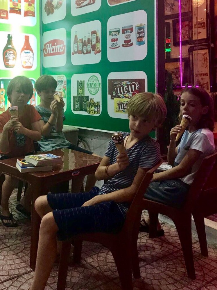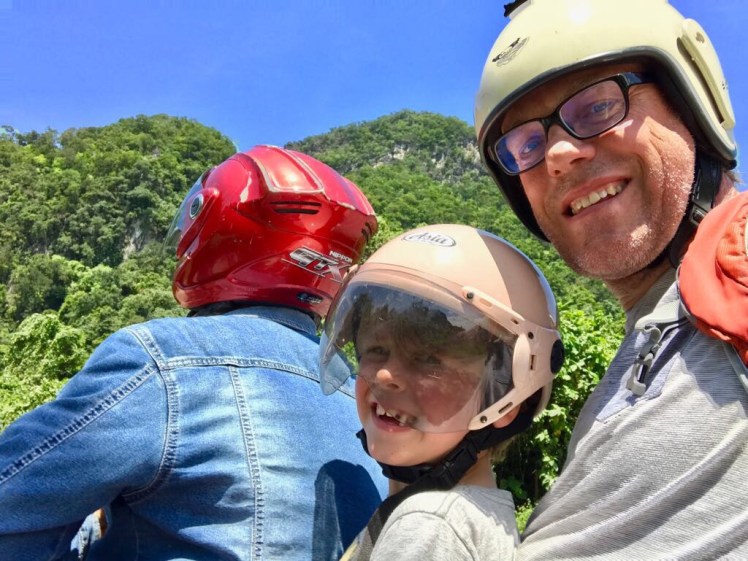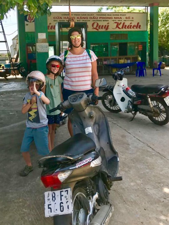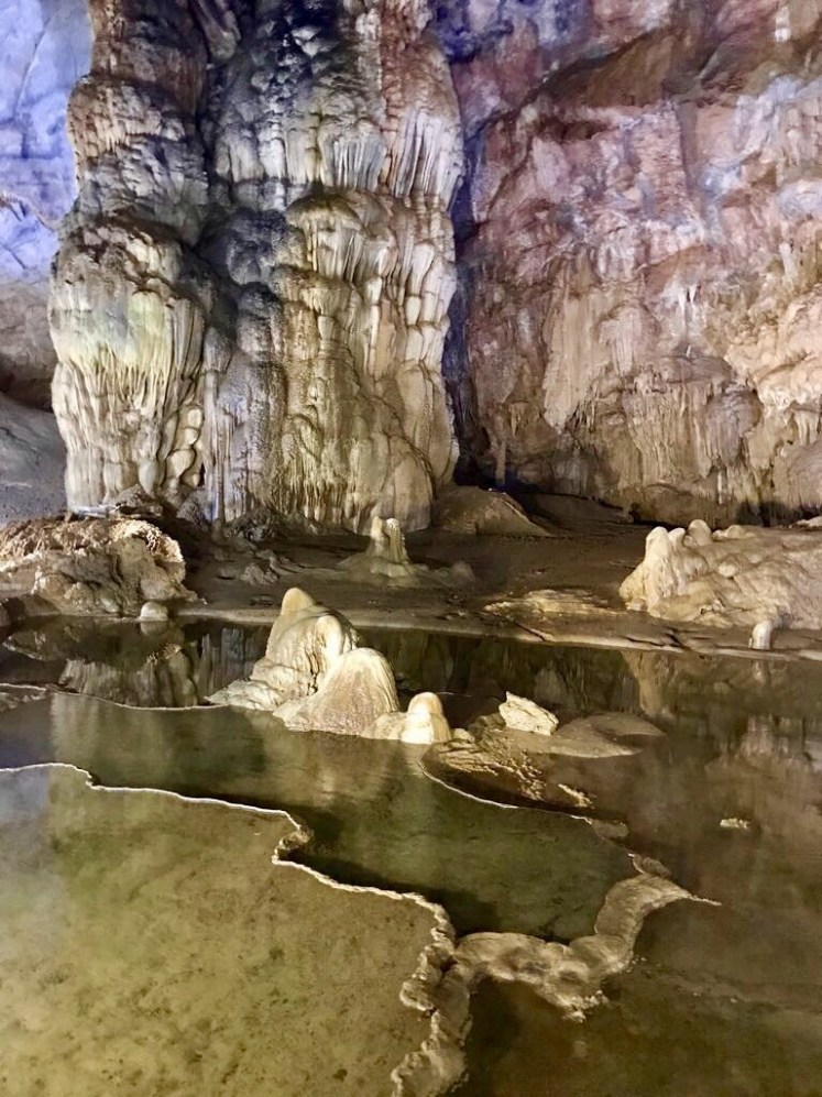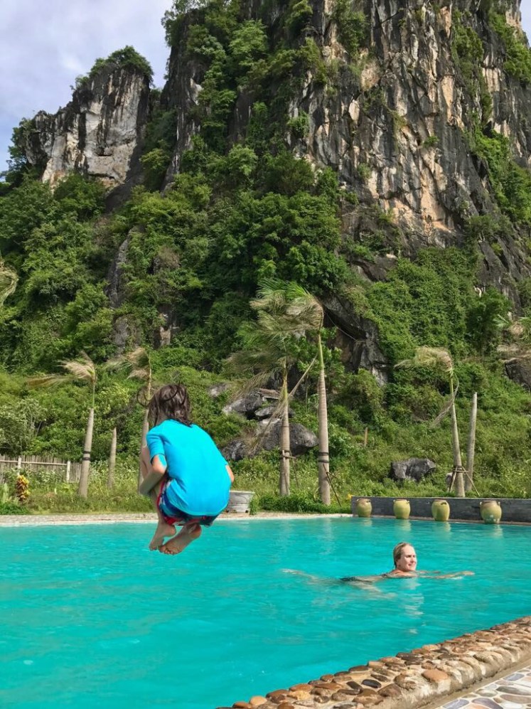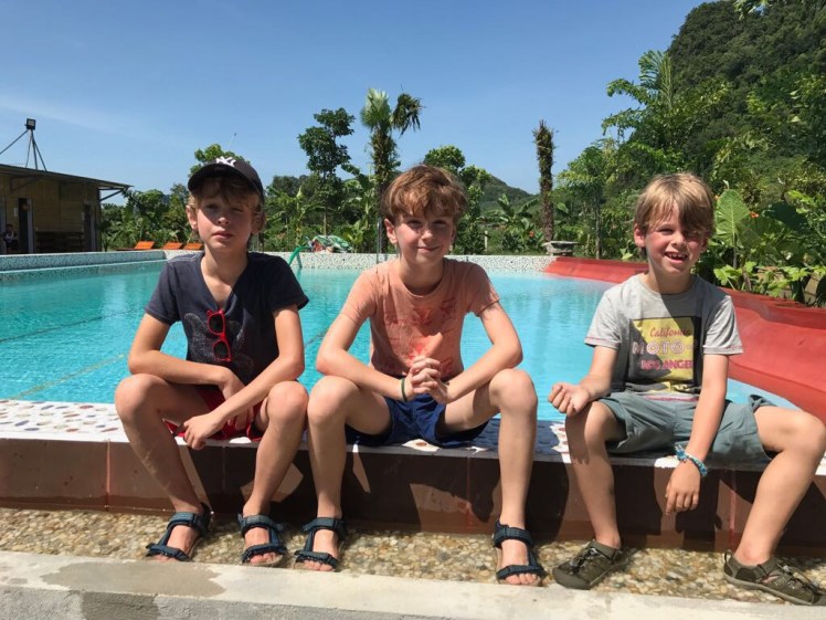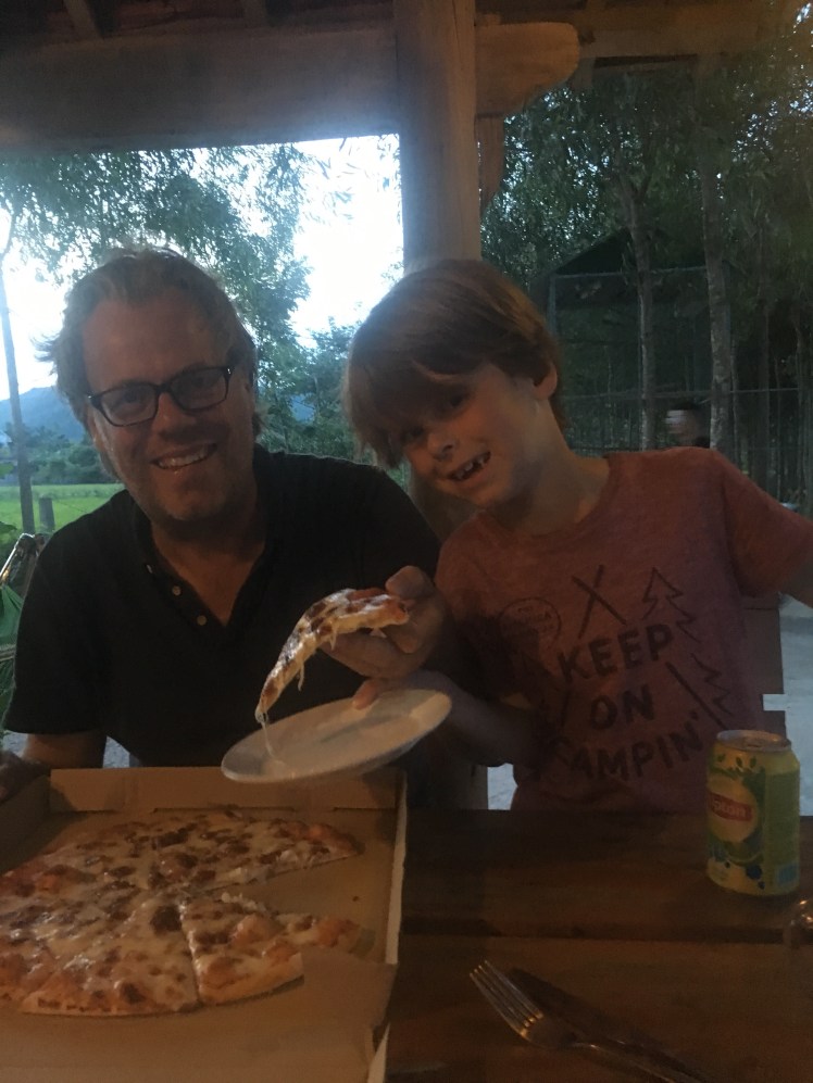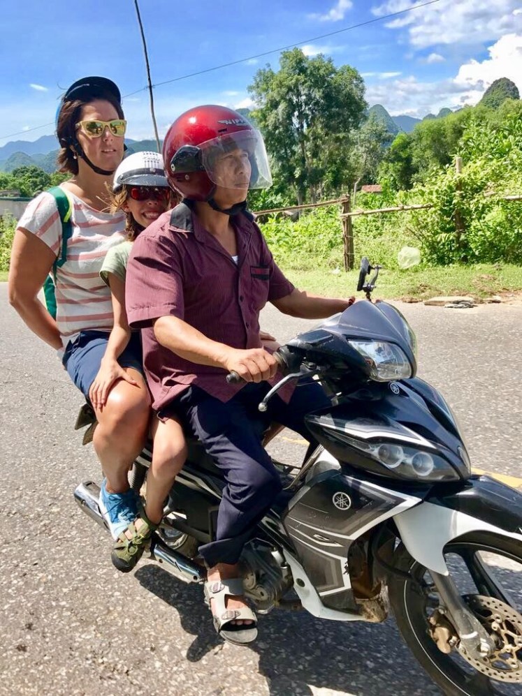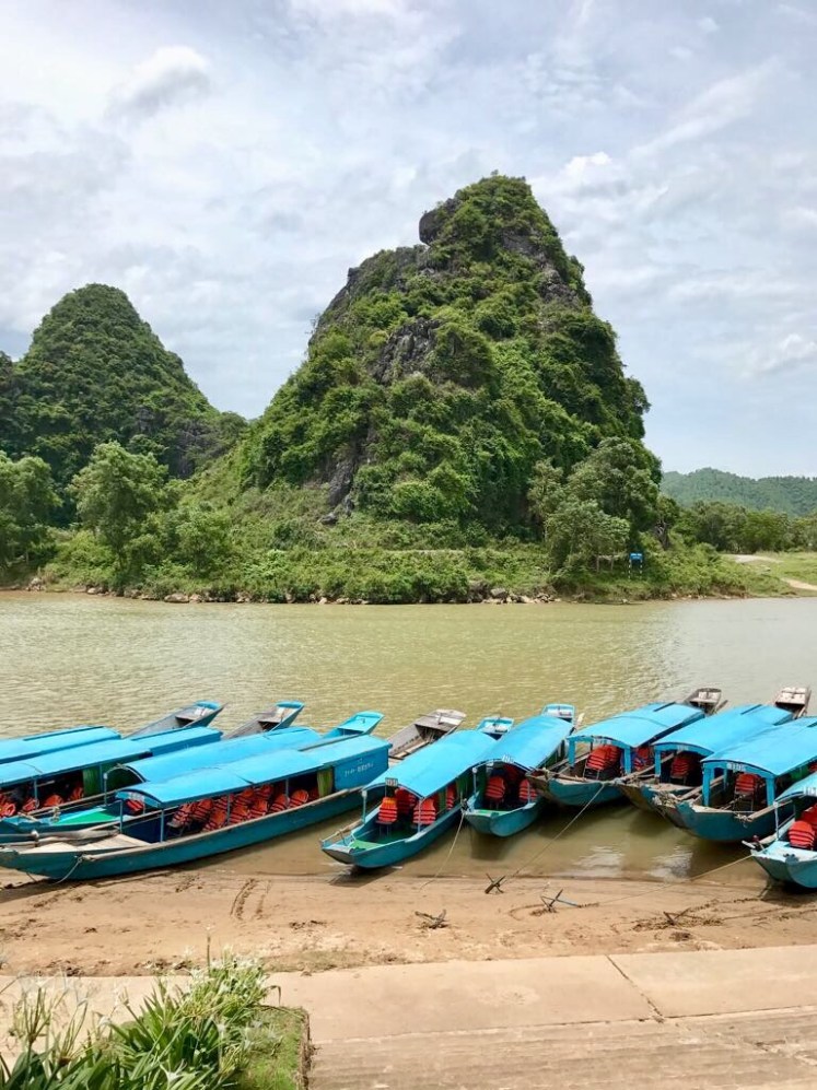 In Phong Nha slapen we in een klein guesthouse met 3 hutjes een stukje buiten het toersistendorpje. De omgeving is waanzinnig! De eerste dag met de (?) easy riders (lokale Hells Angels) op stap geweest naar Paradise Cave. Daarbij ook veel van de onwijs mooie omgeving gezien. Duuk heeft zich goed gehouden (voor zijn doen) en goed gelopen (voor zijn doen). De dag afgesloten in Bomb Crater Bar (wat een naam..). Vandaag is Elske een avontuurlijke tocht doen waar ik Stephan niet aan durfde bloot te stellen. Die had namelijk al spierpijn van de tocht naar Paradise Cave. Dat het voor Duuk aan de pittige kant zou zijn speelde ook wel een beetje mee op de achtergrond… Daarom zijn wij vandaag gaan fietsen en met een bootje naar weer een erg mooie grot geweest. De dag hebben we afgesloten met zwemmen in een hotel in de buurt.