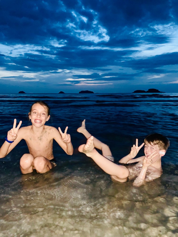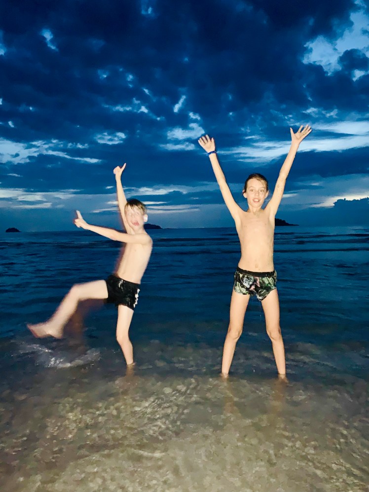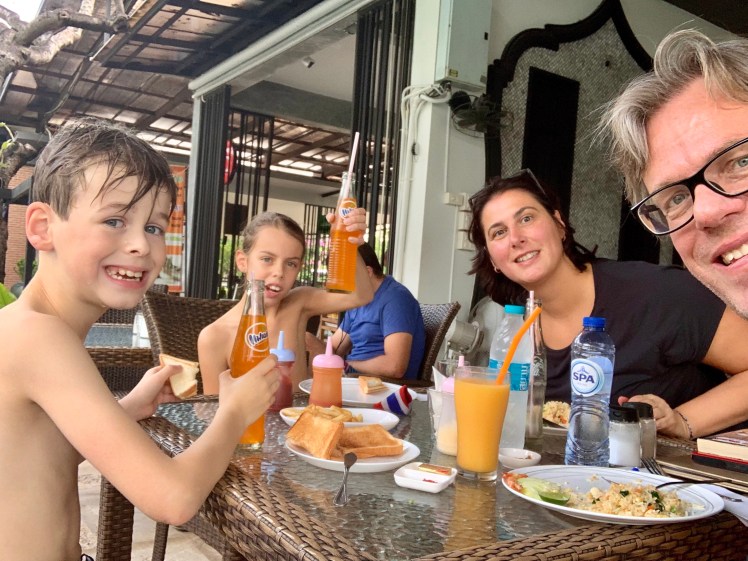 Tsja… en dat je dan joleine laat thuisblijven van school maar wel naar een feestje laat gaan de middag voor vertrek. Het zal wel karma zijn :). Ze kotste dus vrijdagavond in enorme golven braaksel de vloerbedekking, haar bed, de muur en misschien ook wel het plafon onder… Toen we zaterdagavond dus eindelijk naar Schiphol gingen zag iedereen lijkbleek en waren we voorzien van enorme wallen. Gelukkig hadden we een superfijne en rustige vlucht (ondanks de storm). De kinderen hebben bijna de hele vlucht geslapen. Daarna snel met de taxi naar het hotel in Bangkok voor 1 nachtje.