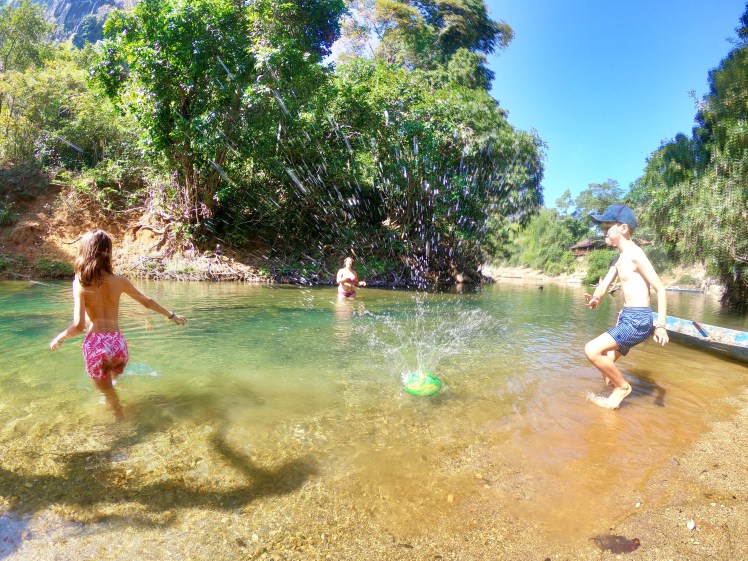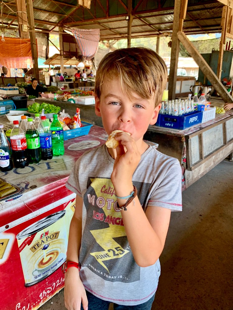 Onze laatste dag in Kong Lor zijn we met een 4-wheeldrive op pad geweest. Eerst op een jungle trek naar een waterval. Er zaten werkelijk waar overal groepen spinnen. De gids begreep niks van de consternatie die dat veroorzaakte. De gids begreep überhaupt niet veel van ons maar dat kan ook komen doordat hij geen woord Engels kon. En toch weerhield hem dat er niet van ons van alles te willen uitleggen over de planten onderweg. Daarna via een plaatselijke markt naar een niet-toeristische grot. Met het drama van de Thaise voetballertjes nog vers in het geheugen zijn we braaf in de buurt van de uitgang gebleven. Op de terugweg struikelden we letterlijk over de slangen… De gids (een andere) sprak herhaaldelijk de woorden ‘no good’ dus we zijn maar uit hun buurt gebleven…. Uiteindelijk bleken we meer dan 8 kilometer te hebben afgelegd, grotendeels door de jungle of grot. En nee, de kinderen zijn niet in de auto blijven zitten (al wilden ze dat wel).