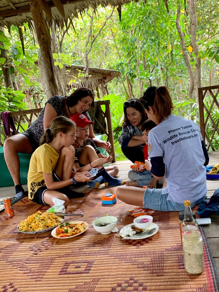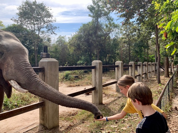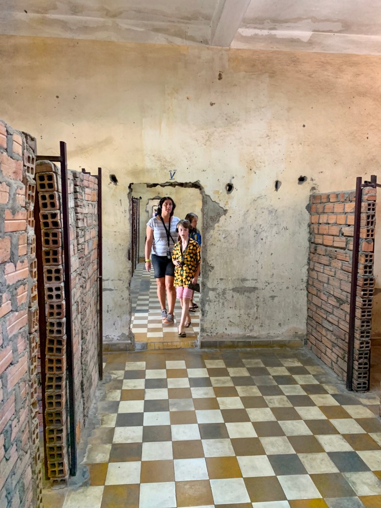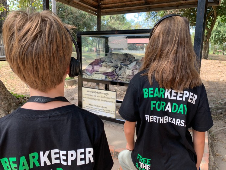 De laatste 2 nachten brengen we door in Phnom Penh. Na aankomst eerst naar Tuol Sleng. Dat was een martelgevangenis ten tijde van de rode khmer. Nu zelfs beschikbaar met audiotour in het Nederlands. Na twijfelen toch maar gedaan met de kinderen en het was goed te doen. Ze waarschuwen voor ranzige stukken dus die kan je dan overslaan.. Toen ik Duuk vroeg hoe hij het vond zei hij, ‘vreselijk, maar goed dat we gegaan zijn.’ Op de laatste volle dag hebben we een opvangcentrum voor wilde dieren bezocht. Hier mochten we de beren verzorgen. Ook een aanrader. Inmiddels zijn we bij het hotel en komt de taxi om ons naar het vliegveld te brengen alweer over 2 uurtjes. Vanmorgen nog naar de killing fields, Burger King en Russische markt gegaan (Joleine en Duuk willen eigenlijk naar het poezencafe…).