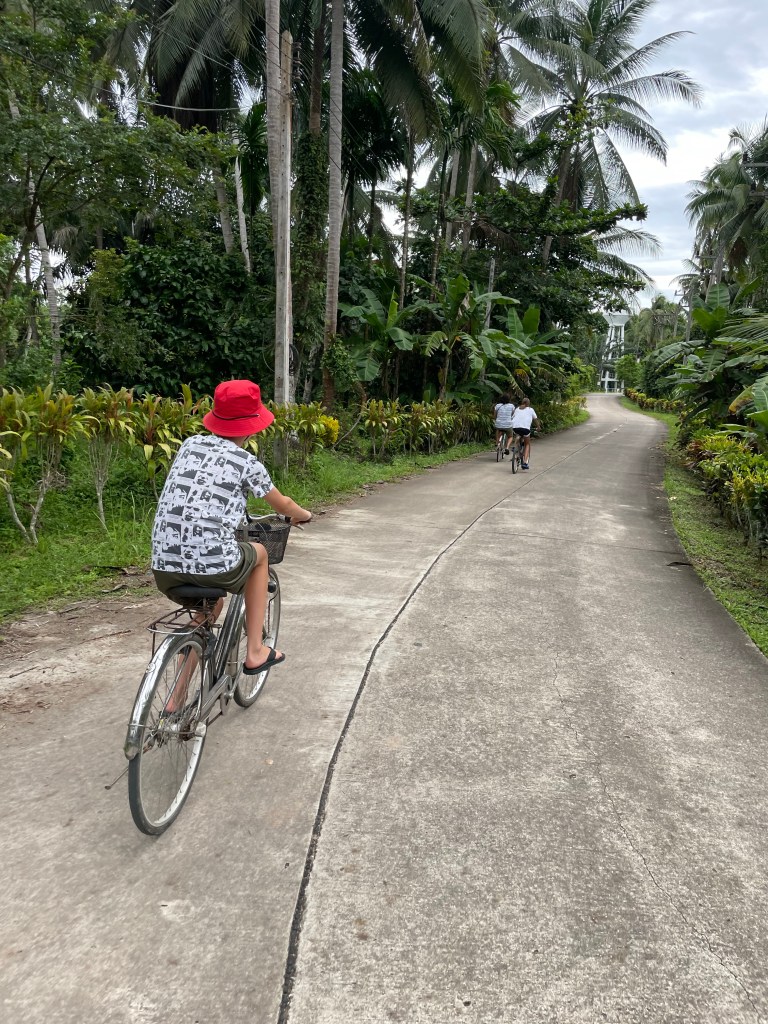 Daarna het eerste deel van de reis naar Khao Sok. Omdat we geen zin hadden 8uur te moeten rijden hebben we de tocht gesplitst en 1 nacht in Chumpon doorgebracht. We zitten in een heel groen guesthouse aan de rivier waar we een stukje gefietst hebben over het Thaise platteland. De mensen houden hier apen die ze leren om kokosnoten uit bomen te halen. Helaas was de monkey school dicht… sowieso is hier veel dicht buiten de toeristengebieden om. ‘s Avonds nog even het stadje ingeweest naar de avondmarkt. En dus ook voor het eerst in het donker gereden (geen aanrader…).