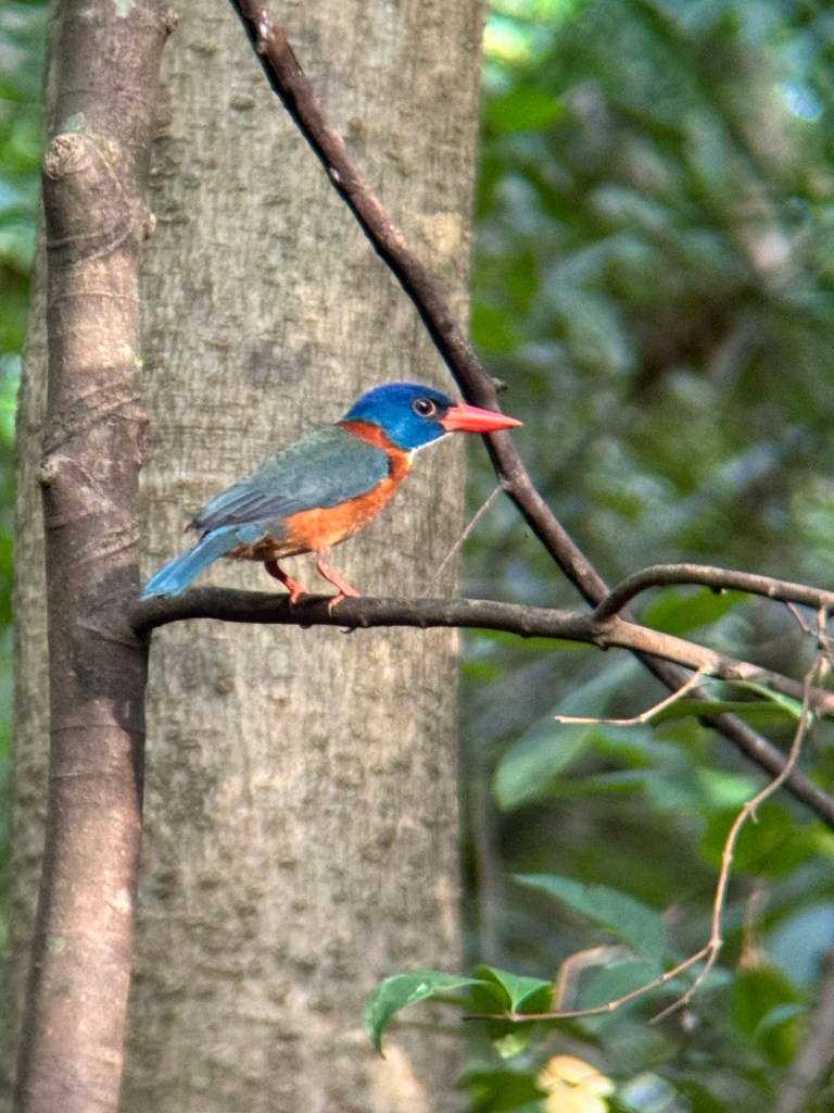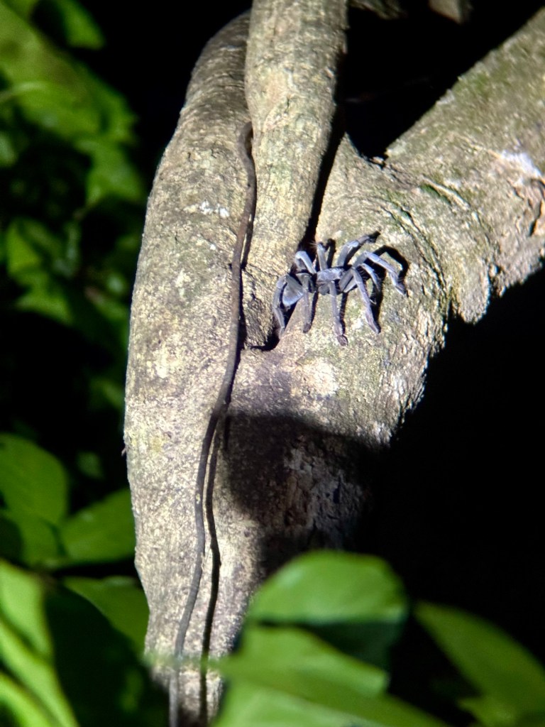 We hebben hier een avond- en ochtendwandeling gedaan. ‘s Avonds voor de spookdiertjes en tarantula. En ‘s ochtends voor de zwarte makaken, hornbills en ijsvogels.