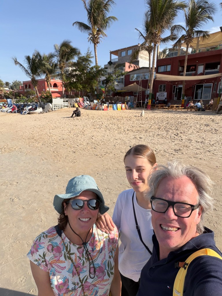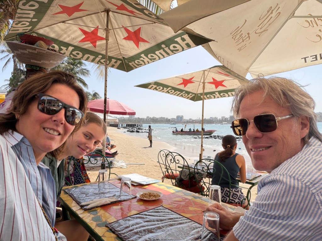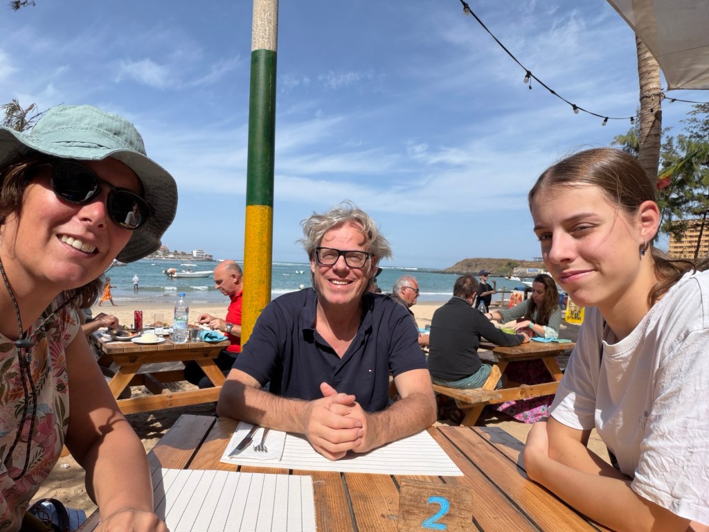 De eerste dag rustig aan gedaan. Naïef als we zijn begonnen we de ochtend met een wandeling van een half uur door de stad op zoek naar een supermarkt. Dat was al een belevenis op zich. Daarna met het bootje over naar ngor. Dat is een eiland dat hier voor de kust bij ons hotel ligt. Verder vooral lekker rondgehangen en geprobeerd te wennen aan Senegal. De verkopers zijn niet normaal zo opdringerig. Het bier veel te Hollands. En de vis heerlijk. Ook moet je niet verbaasd opkijken als er een bloedspoor dwars door het restaurant van het hotel loopt die eindigt bij een net gevangen mega tonijn…